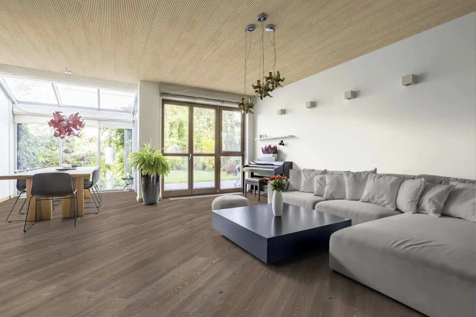 Admonter Parkett Landhausdiele Kernesche Mirage basic im Format classic 2400 x 162 x 15 mm mit ca. 3,6 mm Nutzschicht. Dieser 3-Schicht Parkett mit einer Click & Drop-down-Verbindung ist sowohl für die vollflächige Verklebung als auch für die schwimmende Verlegung geeignet. Die Easy-Care (EC) Oberfläche ist werkseitig wohnfertig geölt, gefast und gebürstet. Weichere Holzteile werden je nach Stärke der Bürstung, mal mehr und mal weniger ausgebürstet. Dadurch erhält der Boden eine plastische Oberfläche. Die pure Sinnlichkeit von Holz wird dadurch sicht- und spürbar. 4-seitig gefaste Kante. Die Sortierung basic ist definiert durch: Das Holzbild zeigt je nach Holzart eine astige bzw. lebhafte Struktur. Es ist schlicht und gefladert, ohne Splint, und weist mittlere, wuchs- und holztypische Farb- sowie Strukturunterschiede auf. Fehlstellen und Risse sind produktspezifisch mit braunem Kitt ausgefertigt. Bei Kernesche muss der Braunkern nicht durchgehend über die gesamte Länge und Breite verlaufen. Risse und teilweise nicht vollständig geschlossene Ausbesserungen gehören zum natürlichen Erscheinungsbild des Holzes. Admonter Parkett Artikelnummer: 139142